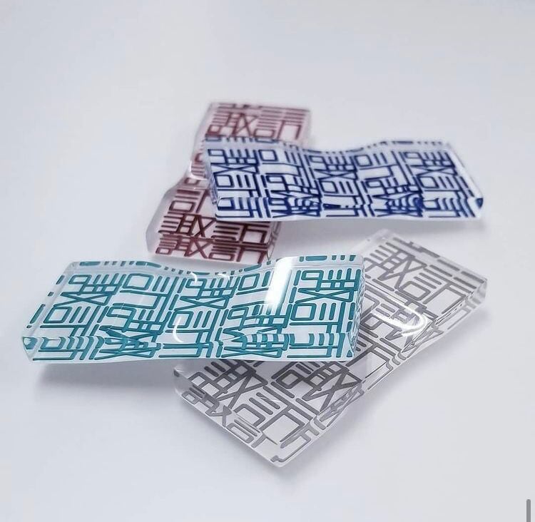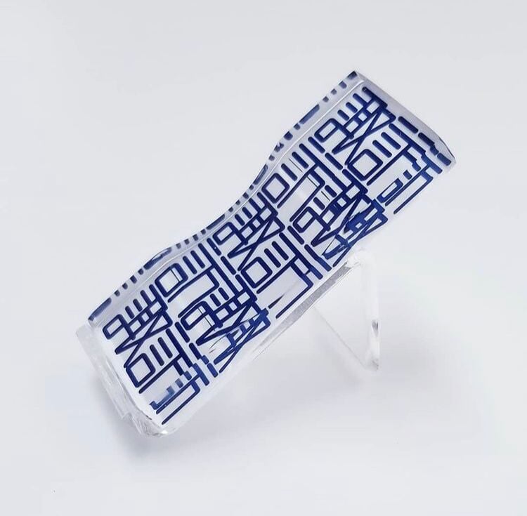 彫刻文字のメカニックさと、アクリルの神秘的な透明感が特徴です。